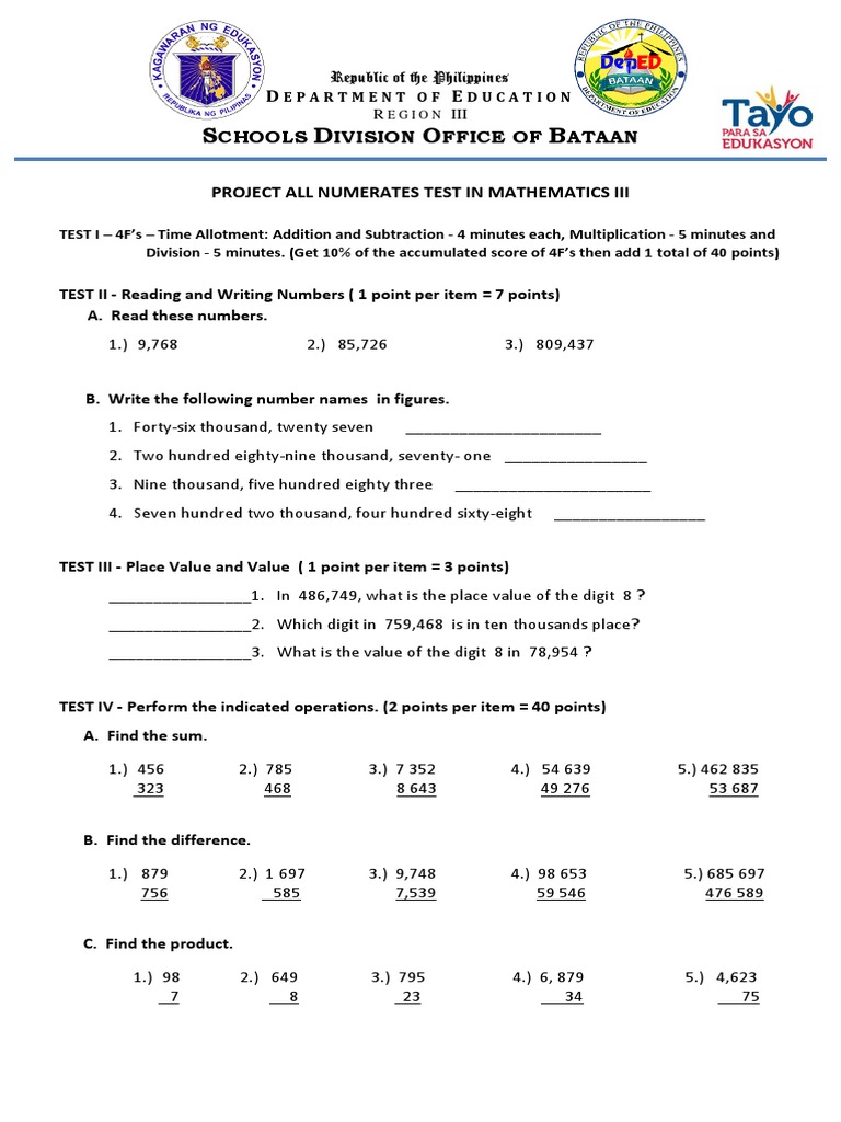 Part Iv 4f S Addition Facts 100 Points Time Allotment For Each Operation 10 Minutes Brainly Ph